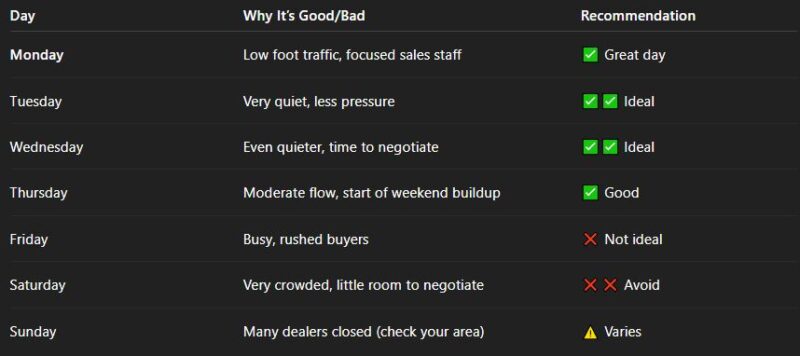 Sometimes it’s not just the month, but the day of the week that makes a difference. Dealerships are often busiest on weekends, which means less attention for you and more rushed decisions.